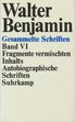 Fragmente vermischten Inhalts. Autobiographische Schriften. Herausgegeben von Rolf Tiedemann und Hermann Schweppenhäuser. Frankfurt am Main, Suhrkamp Verlag, 1986. 8°. 20,5 x 14 cm. 840 Seiten. Original-Leinenband mit Original-Schutzumschlag. ISBN: 351857311X (= Walter Benjamin. Gesammelte Schriften, Band 6). |