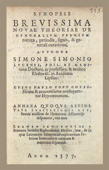 Synopsis brevissima novae theoeriae de humoralium febrium natura, periodis, singnis, & generali curatione ... cuius Paulo post copiosisima & accuratiissima consequentur hypomnemata. Annexa quoque affinitate tractationis est, brevis eiusem de humorum differentijs disputatio, nec non examen sententieae a Brunone Seidelio ... latae de ijs quae Laurentius Jubertus ad explicandam febrium humoralium naturam & materiam disputavit. (Leipzig, ohne Drucker), 1577. 8°. 8 n.n. S., 143 S. 9 n.n. S. Index.; 27 S., 4 n.n. S. Index, 74 S. Neuer Pappband. Adams S 1198. - Wellcome I, 5982. - VD 16 S-6556, - Durling 4220 (nur 1. Teil). - Hirsch V, 411f. - Simoni, ein aus Luca im ersten Drittel des 15. Jahrhunderts geflüchteter Protestant, wurde in Genf Professor der Philosophie und kam über Heidelberg nach Leipzig, wo er 1569 Professor der Medizin wurde. Er war im Streit mit dem im Titel zitierten Bruno Seidel sowie mit Scheck und Buccella. Er wurde verdächtigt Mitglied der Sekte der Socianer zu sein. - Papier gebräunt. Vorsätze fleckig. - Sehr selten.