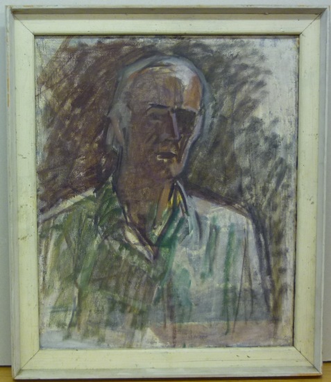Selbstporträt. Oel auf Leinwand. 1985. Bildgrösse: 46x35 cm. Hinten handschrifltich bezeichnet auf Etikett "Selbstbildnis Sept. 1985 Walter Hess" Gerahmt 54x46 cm.