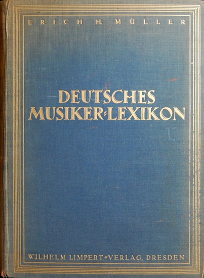 Deutsches Musiklexikon. Dresden, Wilhelm Limpert-Verlag, 1929. Leinen mit goldgeprägtem Titel, [833],VIII Seiten, überwiegend zweispaltig (1644 Spalten), mit 1 Falttafel mit Abkürzungen im Anhang, 29,2 x 22 cm. Einband mit Gebrauchspsuren, sowie - insbesondere am Rücken - ausgebleicht, Rücken und Ecken etwas beschädigt, Schnitt gebrauchsspurig, Vor- und Nachsatz am Gelenk gerissen, gestempelter Besitzervermerk auf dem fliegenden Vorsatzpapier, einige Seitenecken geknickt, innen sauber und in gutem Zustand. 1. Aufl.