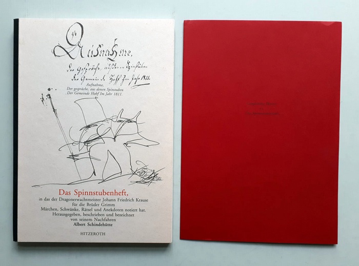 Das Spinnstubenheft, in das der Dragonerwachtmeister Johann Friedrich Krause für die Brüder Grimm Märchen, Schwänke, Rätsel und Anekdoten notiert hat. Herausgegeben, beschrieben und bezeichnet von seinem Nachfahren Albert Schindehütte - Vorzugsaufgabe Hitzeroth, Marburg, 1992. Erstausgabe, Vorzugsausgabe A; Faksimilierte Ausgabe der "Aufnahme, Der gespräche, aus denen Spinstuben Der Gemeinde Hohf Im Jahr 1811" mit einer Übertragung in Druckschrift und burlesk-poetischen, assoziativen s/w-Zeichnungen von Albert Schinderhütte; 111 S. Praktisch keine Gebrauchsspuren, sauber, ausgesprochen guter Zustand. Auf Schmutztitel-Blatt handschr. Signatur und Numerierung 75/iii von Albert Schindehütte, datiert 1992; Beiliegend 2 orig. Radierungen auf Büttenpapier, Blattgröße ca. 23 x 16 cm, Plattengröße 17,5 x 12 cm, vorderseitig handschr. signiert und numeriert wie das Buch, sauber und unbeschädigt. gr.8° Erstausgabe Vom Illustrator signiert.