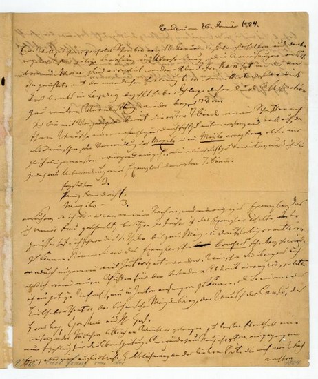 Eigenh. Brief mit U. Breslau, 26. I. 1824. 1? SS. auf Doppelblatt 4to. Nur wenige Monate vor seinem frühen Tod mit nur 44 Jahren, wohl an seinen Verleger Arnold in Dresden, die Handschrift bereits vom Schlaganfall gezeichnet: "Ew. Wohlgebohren geehrtes Schreiben vom 16. Januar habe ich erhalten und danke ergebenst für gütige Berechnung und Übersendung, die Anweisungen [...] sind acceptirt worden. Aber J. Fr. Korn hat nur die an ihn gerichtete mit der mündlichen Erklärung b. m. comittirt, daß er diese Post bereits in Leipzig bezahlt habe. Ich lege daher diese Assignation zur weitern Veranlassung wieder bey. - Ich bin mit Vergnügen bereit die ersten 7 Bände meiner Schriften nach Ihrem Wunsche einer nochmahligen Durchsicht zu unterwerfen, und will auch, da Sie es wünschen, die Verwandlung des Mexiko in ein Mejiko acceptiren, ob sie mir gleich einigermaßen würgend eingeht. Die Durchsicht zu bewirken, muß ich Sie jedoch um Übersendung eines Exemplars der ersten 7 Bände: Erzstufen 3 / Prinz Friedrich 1 / Mexiko 3 ersuchen, da ich von allen meinen Sachen nur ein einziges Exemplar, das ich meiner Frau geschenkt, besitze. Je früher ich das Exemplar erhalte, desto gewisser hoffe ich die 7 Theile bis zum May u. druckfertig remittiren zu können. Können Sie mir das Exemplar schon broschirt schicken so würde dadurch ungemein viel Zeit erspart werden. Wünschen Sie übrigens auch daß ich meine neuen Schriften für den besondern Abdruck arrangire, so bitte ich um gütige Nachricht, um in Zeiten anfangen zu können. Diese wären das Liebhabertheater, der böhmische Mägdekrieg, der Wunsch des Canfu, [...] Christine und ihr Hof. - Beifolgendes Päckchen bitte ich an Winkler [?] gelangen zu lassen. Es enthält eine neue Erzählung für die Abendzeitung. Sie würde zum Neujahr schon eingegangen seyn aber eine [...] Halblähmung an der linken Seite [...] hat mich in jeder Beziehung furchtbar zurückgesetzt. Noch immer bin ich nicht hergestellt, wie Sie aus der Unbildlichkeit meiner Handschrift entschuldigend ersehen werden [...]". - Gebräunt; unbedeutende Randeinrisse.
