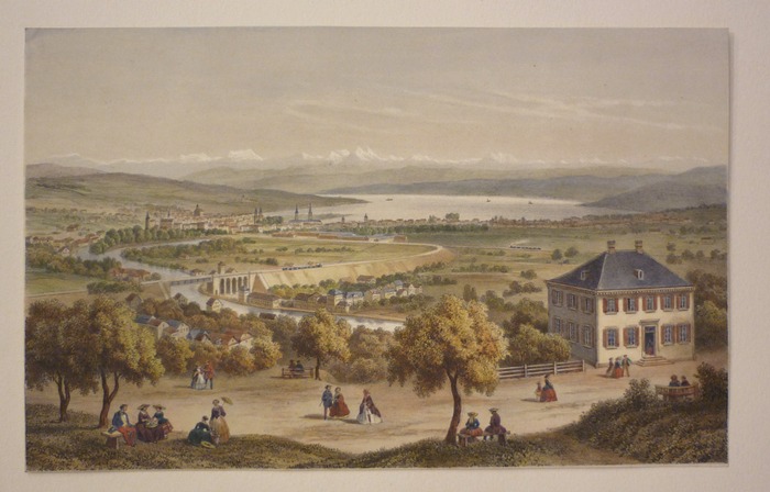 Ansicht von Zürich, von der Waid aus gesehen. Kolorierter Kupferstich mit Farbstift und Aquarell, 19. Jahrhundert. _. 15,7x24,8 cm. Montiert auf weissem Karton, unter neuem neuem Passepartout mit Titel "Zürich".
