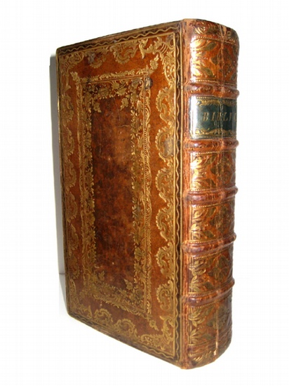 Biblia, Das ist: Die ganze Heilige Schrift Alten und Neuen Testamentes, Nach der deutschen Übersetzung D. Martin Luthers .. Samt einer Vorrede von Hieronymo Burckhardt. 2 Teile in 1. Basel, J. R. Imhoff 1768. 8 Bll., 909 S.; 1 Bl., 265 S., 3 Bl. Mit 2 gest. Frontispizes u. 2 Holzschnitt-Kopfvignetten. Schöner Rokoko-Ledereinband d. Zt. mit reicher floraler Rücken-, Deckel- u. Innenkantenvergoldung u. gepunztem Goldschnitt. Württ. Landesbibl. E 1546. "Offenkundig revidiert, wohl nach den Cansteinbibeln". Gedruckt auf dünnem Papier mit schöner Typographie. Die schönen Tafeln des Augsburger Kupferstechers Emmanuel Eichel (1717-1782) mit 2 Szenen aus dem Matthäus- bzw. Johannes-Evangelium. - Einband minimal berieben. Rücken mit kl. Wurmspur. Wenig stockfleckig. Sehr schönes Exemplar.