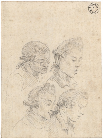 Studienblatt mit vier Männerköpfen, die karikaturhafte Züge tragen. _. Bleistift, auf Bütten, aufgezogen. 20,6 : 15 cm. Provenienz: 1. Sammlung Dr. A. Ritter von Wurzbach-Tannenberg, Wien (Lugt 2587); 2. B. Moser, Wien (Lugt Suppl. 1828a); 3. Blindstempel ABEM (lig.) (nicht bei Lugt); Sammlung H K (mit Lyra) (nicht bei Lugt); handschriftlicher Sammlervermerk von 1901.
