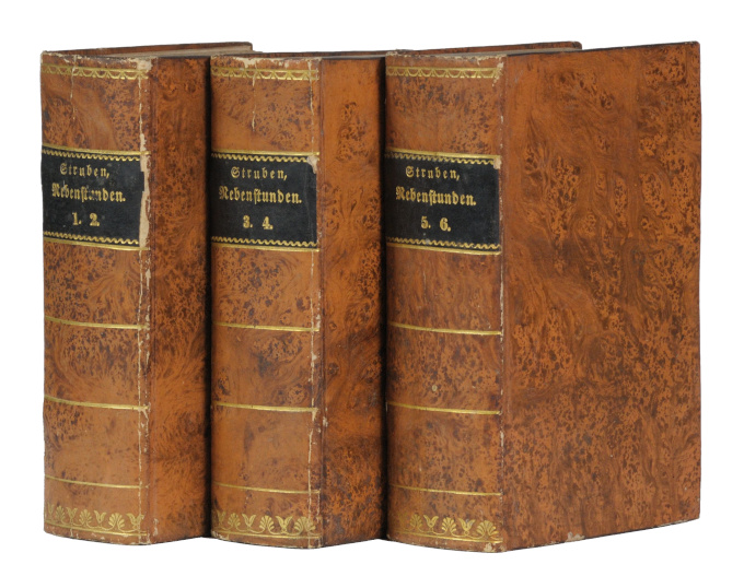 Neben-Stunden. 6 Teile in 3 Bänden. Hannover, Johann Wilhelm Schmidt, 1747-1765. 8°. Mit 4 wiederh. gest. Titelvignetten. Zus. ca. 3.500 S., Marmor. Ppbde. d. Zt. m. goldgepr. Rückenschildern. Erstausgabe (der erste, zuerst 1742 bei Schöder in Hildesheim erschienene Band hier in zweiter Auflage; der ersten bei Schmidt). - Umfangreiche Sammlung von teils ausführlichen Abhandlungen Strubes über verschiedene Themen des Staatsrechts wie Jagd- und Braugerechtigkeit des Adels, ritterlichen Lehndienst, Erbhofämter des Stifts Hildesheim, Ursprung der Landeshoheit in Deutschland, ungleiche Ehen usw. ?[...] auf manche ihrer Resultate haben sich die späteren Forscher wie Eichhorn, selbst Waitz, noch berufen können? (ADB XXXVI, 637). Der letzte Band mit einem ?Haupt-Register über alle Sechs Theile?. - Einbände (bes. Kanten) etw. beschabt. Exlibris (?von Schenck?sche Fidei-Komiss-Bibliothek?) auf den Innendeckeln. Etw. gebräunt u. stockfleckig. - Stintzing/L. III, 258f.
