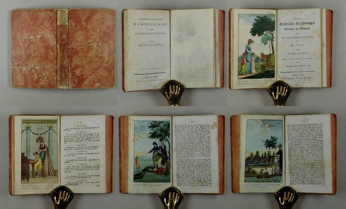 Neue Gespräche, Erzählungen, Gedanken und Maximen zum Gebrauch des Ersten unterrichts für Kinder. Mit einer Vorerinnerung von Georg Carl Claudius. - Nouvelle Méthode d'Enseignement pour la prmière enfance. Leipzig, J.C. Hinrichs., 1802. 8°., VIII, 323 S. Mit gestochenem handkolorierten Frontispiz und 7 Tafeln. Pappband der Zeit mit Kleisterpapierbezügen und gelbem goldgeprägtem Rückenschild. Nicht bei Wegehaupt und den anderen uns zugänglichen Bibliographien. - Originalausgabe in Deutsch-französischem Paralleltext. - Enthält: Neue Unterrichts-Methode für Kinder in Gesprächen. - Die Kinderinsel. Eine wahre Geschichte - Einzelne Gedanken und Maximen. - Über KVK nur ein Exemplar in der "Studienbibliotehk Dillingen" nachgewiesen. - Einband berieben. Durchgehend etwas fleckig. - Sehr selten.