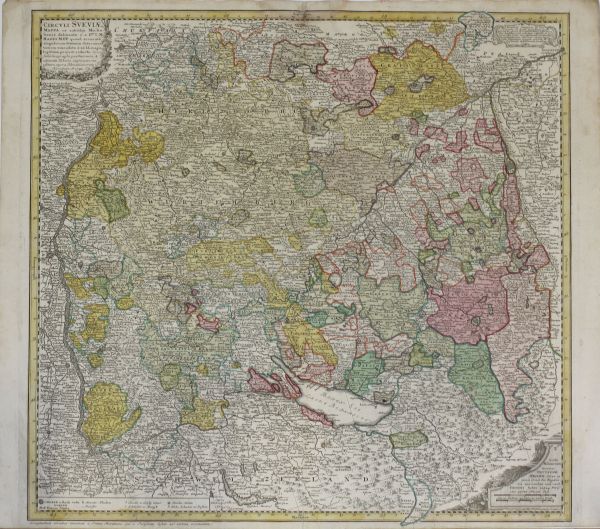 Circuli Sveviae Mappa ex subsidiis Michaliania delineata et a. D. I.M. Hasio [...] - Nürnberg: Homann Erben, 1743. _. Altkolorierter Kupferstich, Bildgröße 51, 5 x 54,5 cm, Blattgröße 53,5 x 61 cm. Altkolorierter Kupferstich von I. M. Hasio. Dargestellt ist die Landschaft Schwaben mit den angrenzenden Gebieten. In der linken oberen Ecke Titelkartusche, oben recht eine kleinere Kartusche mit lateinischem Text. Unten links eine Erklärung der verwendeten Symbole, unten rechts ein Meilenanzeiger. - Hasio ist Johann Matthias Hase, Mathematiker, Astronom, Kartograph und Geograph (1684 - 1742). - Am oberen Blattrand leichte Wasserflecken, den guten Gesamteindruck jedoch nicht beeinträchtigend.