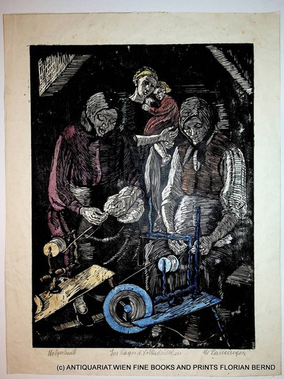 IM LAGER D. VOLKSDEUTSCHEN original kolorierter Holzschnitt bezeichnet und handsigniert _. original Holzschnitt, koloriert, handsigniert Bildformat 39,5x28,5cm. originale Druckgrafik, Margarete manchmal auch Margarethe [von] Pausinger geb. Brunner (Weyer 1880-Lambach1956) Mitglied der K?nstlergruppe MAERZ.