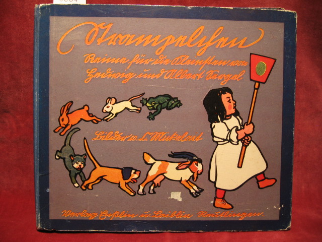 Strampelchen. Reime für die Kleinsten. Reutlingen, Enßlin und Laiblin., 1912. Halbleinenband mit buntem Deckelbild; quer 21 x 24,5 cm; 9 dicke Pappen (incl. Einband) mit großen Farbbildern von Carl Mickelait auf braunem Grund, mit bunten Eckverzierungen und Versen in Sütterlinschrift.(1912). (Kanten etwas berieben; Ecken gering bestoßen; kleine Abriebstellen auf dem Deckel; insgesamt für ein Kleinkind-Bilderbuch von erstaunlich guter Erhaltung) - *** selten! - siehe LKJL Bd.3, 381.
