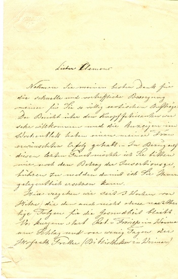2 eigenh. Briefe mit U. Rudolstadt und Jena, 1861. Zusammen (1+2=) 3 SS. auf 3 Bll. 4to und 8vo. An einen Clemens mit der Bitte, ihm ?als Polizeisergeant? gefällig zu sein (I) und mit Dank für dessen Dienste (II). I: ?[...] Nicht für mich sondern für einen Freund, nicht zu bösen sondern zu guten Zwecken möchte ich gerne nähere Nachricht über den in Frankenhausen lebenden Knopffabrikanten Carl Zierfuß erhalten und zwar hauptsächlich über seinen Charakter, seine Bildungsstufe, seinen Umgang und die Verhältnisse, in denen er lebt, so wie, wes Geistes so ungefähr seine Kinder sind [...]? (24. V.; mit kl. unbed. Randläsuren). ? II: ?[...] Der Bericht über den Knopffabricanten war sehr willkommen [...] Hier vergehen wir seit 3 Wochen vor Hitze, die den[n] auch nicht ohne nachtheilige Folgen für die Gesundheit bleibt. Vor kurzem starb Rob. v. Froriep in Weimar am Schlag [...] Meine eigene Familie hat sich bis je[t]zt, Gott sei Dank, vollkommen ungefährdet erhalten. Auch die nächsten Freunde sind grösstentheils wohl, nur hat uns Ried [d. i. der Chirurg Franz Jordan von Ried, 1810?1895] vor einigen Tagen den Schre[c]k gemacht sich plötzlich mit einer heftigen Darmentzündung niederzulegen. Seit gestern ist er indess [!] wieder völlig außer Gefahr [...]? (24. VI.; mit kl. Einr. im unteren Blattdrittel).