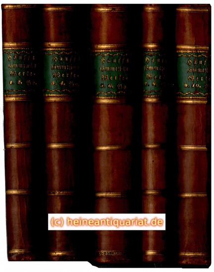 W. Hauffs sämmtliche Werke. Ausgabe in 10 Bänden mit Stahlstichen. [ 10 in 5 Bänden ]. Stuttgart, Friedrich Brodhag'sche Buchhandlung, 1837. (19 x 12,5 cm); 8°; vergoldete Halblederbände der Zeit mit türkisfarbenen Rückenschildchen. 2. Gesamtausgabe. Wilpert / Gühring 2, 15. Mit 1 Porträtstahlstich, 1 Stahlstich im Text und 9 ganzseitige Stahlstiche nach [ Ferdinand ] Fellner. Exlibris auf den Vorsätzen und Namenseintrag alter Hand auf den fliegenden Vorsätzen. Die oberen Kapitale sind berieben, an Band 1 etwas stärker. Kanten sind berieben. Innen teils braunfleckig. Band 9/10 Rücken teils rissig. Leichte Altersspuren an den Buchdeckeln.
