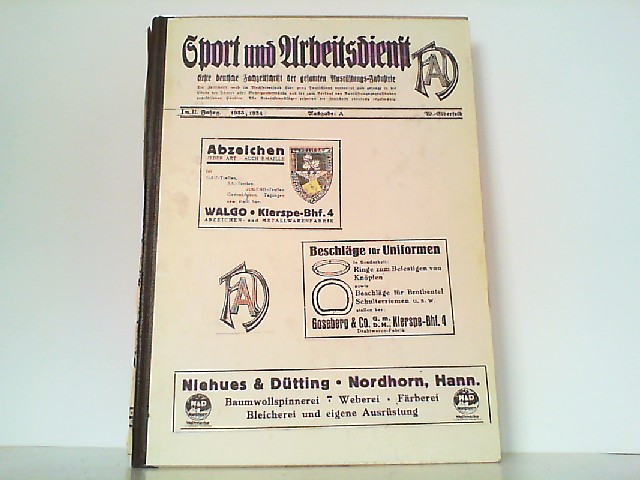 Sport und Arbeitsdienst - Erste deutsche Fachzeitschrift der gesamten Ausrüstungs-Industrie. NACHDRUCK!! Hier Ausgabe A Jahrgang 1933 und 1934 in einem Buch gebunden KOMPLETT! Heft 1 von 1935 mit angebunden. Privater Nachdruck ! von ca., 1990. 4°, zusammen ca. 500 Seiten mit zahlreichen Abbildungen, illustr. Halbleineneinband - Nachdruck von ca. 1990 - sehr guter Zustand. AP56416.
