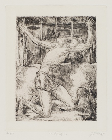 Der Gefangene. Ein mit einem Tuch bekleideter Mann, kniend im Seitenprofil nach rechts, sich an Gitterstäbe klammernd. _. Radierung, 1922, signiert, datiert, numeriert und bezeichnet. 25,8:20,7 cm. Aus ?Künstlerspende für das Deutsche Buchmuseum?, Erste Mappe, Leipzig 1922. ? Söhn HDO Bd. 5, 522-1. ? Nr. 110. ? Tadelloser Abdruck auf strukturiertem chamoisfarbenem Papier. Cissarz war Mitglied der Darmstädter Künstlerkolonie, ab 1906 Professor an der Kunstakademie Stuttgart und seit 1916 in Frankfurt am Main tätig.