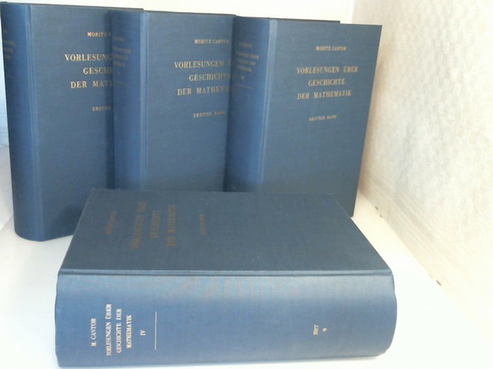 Vorlesungen über Geschichte der Mathematik. Erster Band: Von den ältesten Zeiten bis zum Jahre 1200 n. Chr. Zweiter Band: Vom Jahre 1200 bis zum Jahre 1668; Dritter Band: Vom Jahre 1668 bis zum Jahre 1758; Vierter Band: Vom Jahre 1759 bis zum Jahre 1799. Nachdruck der ersten bis dritten Auflage von 1907/1908. (= Bibliotheka Mathematica Teubneriana - Bände 6, 7, 8 und 9). 4 Bände,. Johnson Reprint Corporation, New York + Teubner, Stuttgart 1965. 941 S. - 943 S. - 923 S. - 113 S. S. mit zahlreichen Figuren, Groß 8°, Original-Leinen, Bibliotheksexemplare (ordnungsgemäß entwidmet), Stempel auf Titel und Schnitt, insgesamt gute und innen saubere Exemplare,.