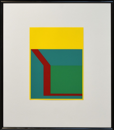 Geometrische Komposition. [Original-Siebdruck, gerahmt / original screenprint, framed]. _. (Georg Karl Pfahler, geb. 08.10.1926 in Emetzheim bei Weißenburg in Bayern, gest. 06.01.2002 ebenda, deutscher Maler, Kü Original-Siebdruck von Georg Karl Pfahler. Im silbernen Metallrahmen hinter Glas gerahmt. Nicht ausgerahmt. Maße Blatt: 21,7 x 15,5 cm. Maße Rahmen: 39,2 x 33,1 cm. Rückseitig mit Haken zur Aufhängung. Innerhalb der dunkelgrünen Fläche ein winziges, unscheinbares Fleckchen, ansonsten sehr guter Zustand. Original screenprint by Georg Karl Pfahler. Framed behind glass in a silver metal frame. Not examined out of frame. Dimensions sheet: 21.7 x 15.5 cm. Dimensions frame: 39.2 x 33.1 cm. With one hook for mounting at the backside. Dark green area with one tiny spot, otherwise fine condition.