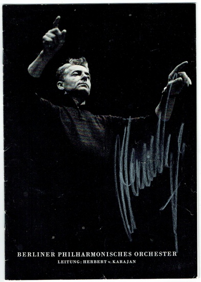 Programm mit eigenh. Unterschrift. Berlin, 3. V. 1967. 8vo. Programm dirigierte am 3. Mai 1967 in der Nürnberger Meistersingerhalle Johann Sebastian Bach, Robert Schumann und Maurice Ravel. Von Karajan auf der Titelseite signiert.