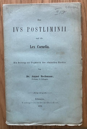 Das Ivs Postliminii Und Die Lex Cornelia: Ein Beitrag Zur Dogmatik Des Römischen Rechts. Erlangen, Andreas Deichert, 1872. 101 Seiten. 8°, Original Karton ( mit Namenszug in Bleistift von Prof. Benöhr, etwas fleckig und bestoßen). Ius Postliminii: Das Ius Postliminii bezieht sich auf das Recht, das eine Person nach ihrer Rückkehr aus der Gefangenschaft wiedererlangt. Wenn jemand in Kriegsgefangenschaft geriet und später befreit wurde, hatte er das Recht, in seinen ursprünglichen Zustand zurückzukehren, als ob er nie gefangen gewesen wäre. Dieses Konzept galt nicht nur für Personen, sondern auch für Dinge wie Eigentum und Besitz. Lex Cornelia: Die Lex Cornelia war eine Gesetzgebung im antiken Rom, die auf den römischen Juristen Sulla zurückgeht. Sie umfasste verschiedene Rechtsbereiche, darunter das Strafrecht und das Wahlrecht. In Bezug auf das Strafrecht behandelte die Lex Cornelia unter anderem die Verfolgung von Mord und Vergiftung. - Seiten unaufgeschnitten, durchgehend leicht stockfleckig, ansonsten gut erhaltenes Exemplar. PA2.