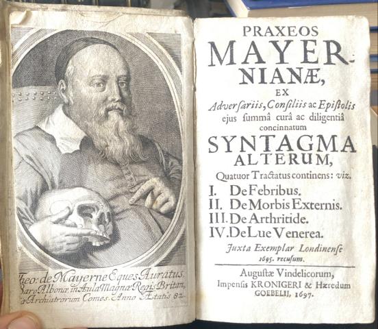Praxeos Mayernianae ex adversariis, consiliis ac epistolis ejus summa cura ac diligentia concinnatum syntagma alterum. Quatuor tractatus continens : viz. I. De febribus - II. De morbis externis - III. De arthritide - IV. De lue venerea. 4 Teile in 1 Band. Mit gestoch. Porträt als Frontispiz. Augustae Vindelicorum, Kroniger, 1697. Kl.-8°. 5 Bll., 394 Seiten, 3 Bll. Pergament d. Zt. (etwas fleckig u. berieben, Gelenk mit kl. Läsur). Iuxta Exemplar Londinense 1695. recusum. - VD17 23:244235L - Ferchl 348 - T. T. de Mayerne war ein Genfer Mediziner, Leibarzt des französischen und englischen Königs. Er studierte in Heidelberg und in Montpellier und befasste sich schon früh mit Anwendungen der Chemie in der Medizin im Anschluss an Paracelsus. 1600 liess er sich als Arzt in Paris nieder und wurde 1600 Leibarzt des französischen Königs Heinrich IV. Er lehrte den Gebrauch von Quecksilber, Zinn, Eisen und Antimon-Verbindungen, bis die Medizinische Fakultät 1603 diese Art Medikamente verbot. Nach der Ermordung von Heinrich IV. 1610 ging er 1611 nach England, wo er Leibarzt des englischen Königs Jakob I. war. 1620 entdeckte er beim Auflösen von Eisen in verdünnter Schwefelsäure Knallgas (Wasserstoff), das heisst eine luftförmige entzündbare Substanz. Veröffentlicht wurde dies 1700 in der von ihm initiierten Pharmacopeia (dem Verzeichnis aller Medikamente in England). Er führte Quecksilber(I)-chlorid (Calomel) in die Medizin ein (besonders gegen Syphilis) und beschrieb das zugehörige Mineral (Kalomel). Die Rezepte sammelte er im sogenannten Mayerne-Manuskript. Seine medizinischen Aufzeichnungen wurden 1690 als Praxis medica von Theodore de Vaux, seinem Patenkind, veröffentlicht. - Teils gebräunt und etwas braunfleckig. Schr-Fl-re Bei Bestellungen auf Rechnung bleibt Vorkasse vorbehalten. Bestellungen erfolgen ohne Gewähr und gelten erst nach Bestätigung der Verfügbarkeit. Payment in advance is reserved for orders on account. Orders are made without guarantee and are only valid after availability has been confirmed. The shipping costs to non-EU countries may vary depending on the weight. We also offer cheaper shipping options for books up to 1000g.