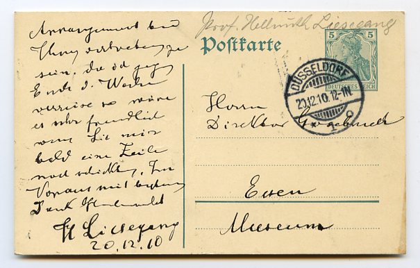 Eigenh. Postkarte mit U. (?H. Liesegang?). [Düsseldorf], 20. Dezember 1910. 2 SS. (Qu.-)8vo. Mit eh. Adresse. An den Kunsthistoriker und Direktor des Kunstmuseums Essen Ernst Gosebruch (1872?1953) betr. der Aufhängung seiner Bilder für eine Ausstellung. ? Nach einem Studium bei Eugen Dücker an der Kunstakademie Düsseldorf und Studienreisen in die Niederlande, nach Belgien und Paris wurde der Bruder des Historikers und Bibliothekars Erich Liesegang Mitglied des Künstlervereins ?Malkasten? und 1919 der Akademie in Düsseldorf. ?Liesegang schuf Radierungen und Gemälde, auf denen er vor allem niederrheinische Landschaften und Städteansichten darstellte (u. a. ?Letzte Sonne?)? (DBE). ? Papierbedingt leicht gebräunt.