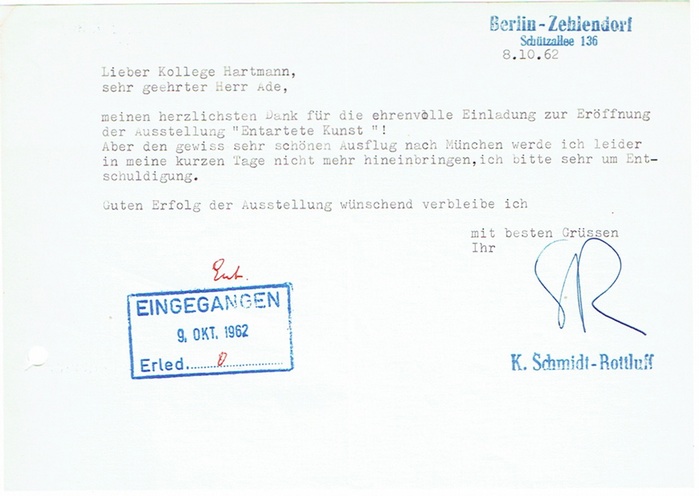 3 ms. Briefe mit eigenh. Unterschrift ?SR? und 1 eigenh. Brief mit Unterschrift ?SR?. Berlin, Sierksdorf, 1952-1962. Quer-8vo. 4 pp. Gelocht. Mit Eingangsstempel. Zusätzlich mit Namensstempel und Adressstempel. Briefwechsel zwischen Karl Schmidt-Rottluff und dem Haus der Kunst. Beiliegend sind Durchschläge von Gegenbriefen Ades. Im Briefwechsel von Juli 1952 wird Schmidt-Rottluff um die Angabe der Preise der in der ?Grossen Kunstausstellung München 1952 befindlichen Werke?. In den Schreiben von Juli 1957 ist Schmidt-Rottluff verärgert darüber, dass zwei seiner Bilder in einer Jahresausstellung gezeigt werden: ?[?] bei aller kollegialen Verbundenheit habe ich leider Anlass, im höchsten Grade befremdet zu sein. Es sind 2 Bilder von mir jetzt ausgestellt worden, die nicht für die Ausstellung in München bestimmt waren, sondern allein für Rom. Für eine Jahresausstellung liegen die Bilder zuweit zurück, waren ausserdem in München bereits andernortes ausgestellt. Ich muss daher bitten, die Bilder aus der Ausstellung herauszunehmen und mir wieder zurückzuschicken - nach diesem Vorkommnis habe ich keine Neigung mehr, sie mit nach Rom zu geben [?]? 1962 geht es um die Einladung zur Eröffnung der Ausstellung ?Entartete Kunst. Bildersturm vor 25 Jahren?, die sich auf beschlagnahmte Werke und verfemte Künstler konzentrierte.Karl Schmidt-Rottluff gilt als ein Klassiker der Moderne und als einer der wichtigsten Vertreter des Expressionismus. Er gehörte der Künstlergruppe Brücke an. Im Jahr 1937 wurden Schmidt-Rottluffs Werke (608 Arbeiten) in den deutschen Museen als ?Entartete Kunst? beschlagnahmt, einige von ihnen wurden dann in der Ausstellung ?Entartete Kunst? gezeigt. Bei der Gemäldeverbrennung am 20. März 1939 im Hof der Berliner Hauptfeuerwache wurden mehrere seiner Werke vernichtet. Peter Ade (1913-2005) war seit 1950 Geschäftsführer der Ausstellungsleitung und Direktor des Hauses der Kunst. Er organisierte Ausstellungen mit einem Schwerpunkt auf die Klassische Moderne, aber auch kulturhistorische Themen. Ade organisierte ab 1955 nach amerikanischem Vorbild einen Mäzenatenkreis des Hauses der Kunst aus Industrievertretern.Karl Schmidt-Rottluff war ein Er gilt als ein Klassiker der Moderne und als einer der wichtigsten Vertreter des Expressionismus.