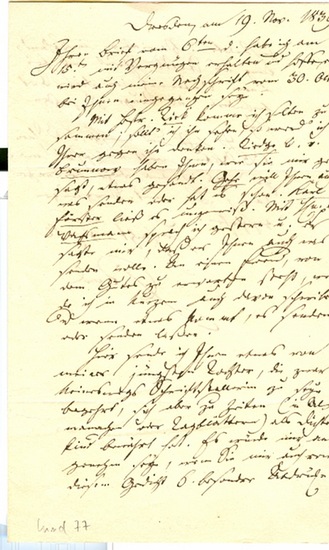 2 eigenh. Briefe (davon einer mit ausgeschnittener U., der zweite mit U.). Dresden, 30. Okt. u. 19. Nov. 1839. 3 SS. 4to und 8vo. An Heinrich Meyer (1812?1863) in Braunschweig, den Herausgeber des ?Gutenbergs-Album? (1840): ?[?] Die Eile, in welcher ich unterm 25. d. M. ein Gedicht zu dem Gutenbergs-Album an Sie expedierte hat mich [?] eine kleine Notiz vergessen lassen, welche zur Vollständigkeit noch gehört. Haben Sie die Güte, zu der vorletzten Nota, welche von dem Wappen der Buchdrucker-Gilde handelt [?] noch zu setzen: Derselbe Kaiser soll auch im J. 1466. Gutenbergs Lehrlinge, dem Johann Mäntelin, aus Strasburg gebürtig, einen gekrönten Löwen als Schildzeichen verliehen haben. | Eben erfahre ich aus dem Morgenblatte, daß auch in Kassel [?] ein dem Ihrigen fast ähnlichen Unternehmen am Werke sei [?]? ? ?[?] Mit Hofrat Tieck komme ich selber zusammen; sollt? ich ihn sehen, so werd? ich Ihrer gegen ihn denken. Tiedge u. v. Brunnow haben Ihnen, wie sie mir gesagt, etwas gesandt. Gehe will Ihnen auch was senden oder hat es schon. Karl Förster ließ es ungewiß. Mit Hn. v. Wachsmann sprach ich gestern u. er sagte mir, daß er Ihnen auch was senden wolle [?] Variation in Behandlung des Stoffs scheint mir bei einem Unternehmen dieser Art besonders ins Auge zu fassen seyn. Ich hoffe und wünsche, daß Ihnen dies Album recht viel Ehre mache [?]? ? Kinds Ballade ?Stein und Wein? erschien in der erwähnten Anthologie auf den Seiten 70?77, allerdings ohne die nachgereichte Fußnote. ? Der erste Brief minimal fleckig.