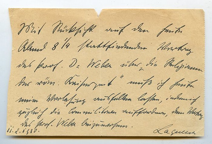 Eigenh. Mitteilung mit (?Laqueur?). O. O., 11. Februar 1930. 1 S. Qu.-8vo. Aushangzettel an seine Studenten mit der Mitteilung, daß er ?mit Rücksicht auf den heute Abend 8? stattfindenden Vortrag des Prof. Dr. Weber über ?Die Religionen der röm. Kaiserzeit?? seine Vorlesung ausfallen lassen werde. ? Der Bruder des Mediziners August Laqueur studierte klassische Philologie und Geschichte in Bonn und Straßburg, wo er 1904 promovierte. ?Nach Reisen in den Mittelmeerraum habilitierte er sich 1907 für klassische Philologie und Hilfswissenschaften und war seit 1909 a.o.Prof. in Straßburg. 1912 wurde er o.Prof. der alten Geschichte in Gießen, 1930 in Tübingen und 1932 in Halle. 1936 vorzeitig pensioniert, emigrierte er 1939 in die USA. 1953 ging er nach Hamburg und wurde 1959 Honorarprofessor. Laqueurs Interesse galt vor allem der antiken Historiographie und der Urkundenlehre; er veröffentlichte u. a. ?Polybios? (1913, Nachdr. 1974)? (DBE). ? Stärker gebräunt und mit einem kleinen Ausriß am oberen Rand; der linke Rand etwas unregelmäßig beschnitten.