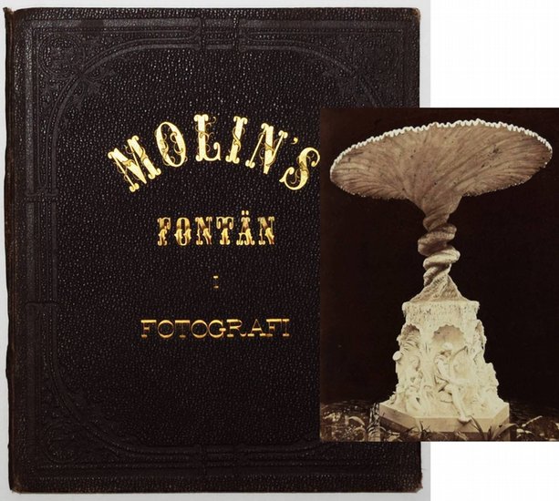 Molins Fontän. Fotografi. Med Text. Stockholm, Norstedt & Soner, (1866). 4° (24 x 20 cm.). 32 S. mit 7 mont. Orig.-Photographien (Albumin-Abzüge, 13,5 x 10,5 cm.). Blindgeprägter Orig.-Leinenband mit goldgeprägtem Deckeltitel. Roosens/Salu 5508. The Truthful Lens 93. - Zweite Ausgabe (im Jahr der ersten Ausgabe) des ersten schwedischen Buchs mit Original-Fotografien. - Mit Prosatexten und Gedichten von Karl Wetterhoff u. a. über den ältesten noch funktionierenden Brunnen Stockholms. Die Bronzeskulptur des Brunnens wurde von Johan Peter Molin (1814?1873) entworfen. Molin erhielt den Auftrag für den Brunnen im Frühjahr 1866. Brunnenskulptur aus Gips wurde auf der großen Kunst- und Industrieausstellung in Kungstradgarden ausgestellt. Der Brunnen wurde am 25. September 1873, kurz nach Molins Tod, eingeweiht. - "The texts, poetry and prose by various Swedish writers, were inspired by Johann Peter Molin's fountain, which was erected in Stockholm. Illustrated with 7 albumen photographs by Jaeger of the original plaster model of the fountain. Jaeger, a German established in Stockholm as early as 1860, is styled as photographer of the Svenska NationalMuseum. The book was sufficiently popular for two editions to appear in one year. It is stated to be the first Swedish book illustrated with original photographs" (W. J. Naef in The Truthful Lens). - J. W. Jaeger (1832-1908) wurde in Berlin geboren, wo er sich im Alter von 16 Jahren an der Akademie der Kunste einschrieb.1857 besuchte er zum ersten Mal Schweden und eröffnete einige Jahre später ein Fotoatelier in Stockholm. Sein Studio zog bald Mitglieder der schwedischen High Society an, und Jaeger wurde zum Fotografen à la mode der gesellschaftlichen und wirtschaftlichen Elite des späten 19. Jahrhunderts. Er beschäftigte sich aber auch mit experimenteller Fotografie und war einer der ersten Werbefotografen. - Zeitgenöss. Besitzvermerk ("Maria von Wright, Juli 1867") auf dem Vorsatz, sehr gutes sauberes Exemplar. Second edition (in the year of the first edition) of the first Swedish book with original photographs. - With prose texts and poems by Karl Wetterhoff, including one about Stockholm's oldest still-functioning fountain. The bronze sculpture of the fountain was designed by Johan Peter Molin (1814?1873). Molin received the commission for the fountain in the spring of 1866. A plaster model of the fountain was exhibited at the large art and industry exhibition in Kungstradgarden. The fountain was inaugurated on September 25, 1873, shortly after Molin's death. - J. W. Jaeger (1832?1908) was born in Berlin, where he enrolled at the Academy of Arts at the age of 16. He visited Sweden for the first time in 1857 and opened a photography studio in Stockholm a few years later. His studio soon attracted members of Swedish high society, and Jaeger became the photographer à la mode of the social and economic elite of the late 19th century. He was also involved in experimental photography and was one of the first advertising photographers. - Contemporary ownership note ("Maria von Wright, July 1867?) on the flyleaf, very good clean copy.