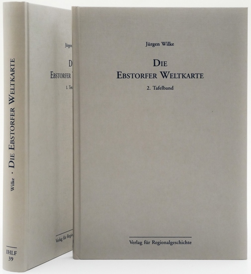 Die Ebstorfer Weltkarte. - [2 Bände]. - Bielefeld:, Verlag für Regionalgeschichte, 2001. 2 Bände: 347 Seiten, 2 Bll. Verlagsanzeigen; 167 Seiten, 1 mehrfach gefaltete farbige Tafel (Faksimile) in Beilagentasche auf dem hinteren Spiegel des Tafelbandes, OPpbde., 24,5 x 17 cm. 2 Bände (= vollständig). - Band 1: Textband. - Band 2: Tafelband. - Mit dem Faksimile der Karte als Beilage (in der Beilagentasche des Tafelbandes). - Überarbeitete und ergänzte Fassung der Dissertation Wilkes. - (= Veröffentlichungen des Instituts für Historische Landesforschung der Universität Göttingen, 39). - Provenienz: Joachim Kersten (Rechtsanwalt und Literaturvermittler, 1946-2023; Nachlassexlibris auf den vorderen Spiegeln; datierter Namenszug in zartem Bleistift auf dem vorderen fliegenden Vorsatzblatt des Textbandes). - Seiten 277 bis 294 oben eselsohrig (mutmaßlich herstellungsbedingt). Sonst gute Exemplare auf gutem Papier.