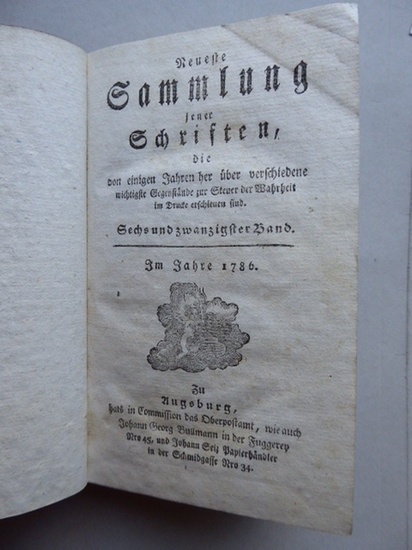 Neueste Sammlung jener Schriften die von einigen Jahren her über verschiedene wichtige Gegenstände zur Steuer der Weisheit im Drucke erschienen sind. Sechsundzwanzigster (26.) Band. Im Jahre 1786 Zu Augsburg hats in Commission das Oberpostamt, wie auch Johann Georg Bulllmann in der Fuggerey. Nro. 45 und Johann Seiz Papierhändler in der Schmiedgasse Nro. 34. Augsburg, (1786). 5 Teile in einem Band. 80 Seiten, 94 Seiten, 136 Seiten, 64 Seiten u. 79 Seiten. Karton-Einband der Zeit ohne Titel. 17x10,5 cm. * Sehr selten ! --- Enthält die fünf Beiträge: Beytrag zu einer Apologie des Mönchs-Standes, aus statistischen und religiösen Gründen. Aus dem Französischen frey übersetzt mit Anmerkungen (anonym) von Friedrich R. Salzmann (80 Seiten) --- Kann die Ehrlichkeit mit der Freydenkerey bestehen ? --- Nöthige Anmerkungen über des dritten Bandes zweytes Stück einer periodischen Schrift, der Freymüthige genannt von (anonym) Philipp Jakob Streyrer 1784 (136 Seiten) --- Antworte dem Thoren nach seiner Thorheit: Das ist, gründliche Widerlegung des sogenannten katholischen Oesterreichers, der unlängst eine Schmähschrift wider den Hochw. Herrn Aloys Merz, Domprediger in Augsburg, herausgab: Verfaßt von einem oberösterreichischen Weltpriester Franz Steininger (64 Seiten) --- Briefe eines Pönitenzers der Metropolitankirche zu ***. An einen Theologal der Kathedralkirche zu *** über die Religionsangelegenheiten unserer Zeiten. Aus dem Französischen ins Deutsche übersetzt (79 Seiten) ------- Philipp Jakob Steyrer (getauft 10. Februar 1715 in Freiburg im Breisgau; ? 7. November 1795 in St. Peter (Hochschwarzwald)) war der vorletzte Abt des Klosters St. Peter auf dem Schwarzwald und der Abt, unter dem Klosterkirche und Konventsgebäude ihre heutige Form erhielten. In den 1780er Jahren erschienen in Freiburg vier Bände einer Zeitschrift Der Freymüthige des Professors der Juristischen Fakultät Johann Kaspar Ruef. Darin wurden Einrichtungen und Dogmen der Kirche, nicht zuletzt das Mönchtum, im Sinne des Josephinismus angegriffen, zum Teil recht herausfordernd. Steyrer antwortete 1785 und 1786 mit drei Schriften Nöthige Anmerkungen (zu der Zeitschrift 'Der Freymüthige'), zum Teil ebenfalls polemisch. In einer Schrift von 1787 verteidigte er den Zölibat ?mit hinreißenden Worten; man spürt es, daß dies sein eigentliches Thema ist, über das er ... oft zu seinen geistlichen Söhnen gesprochen hat?.(Quelle Wikipedia) --- Franz Steininger (Theologe) (1739?1805), österreichischer katholischer Theologe (Geringe Gebrauchsspuren).