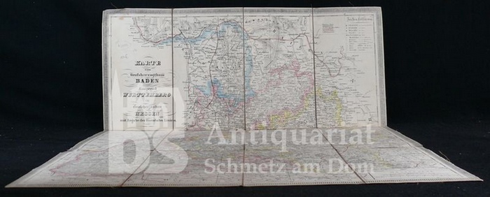 Karte vom Großherzogthum Baden, Königreich Württemberg und Großherzogthum Hessen mit Angabe der Eisenbahn Linien. Kolorierte Karte. Carlsruhe, Franz Nöldeke (ca 1850). 62.5 x 48 cm. In 12 Segmenten auf Lwd. Minimal braunfleckig.