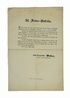 Edle Züge von Menschlichkeit und Wohlthun! Meine Herren Mitbürger und Kameraden! Es wird wohl Einigen von Ihnen bekannt seyn, daß, als in den Tagen nach Bekanntmachung der Abreise Seiner Majestät eine sehr üble Stimmung gegen unsere wackere akademische Legion in dem größten Theile unseres Mittelstandes herrschte [...]. Viel haben die löblichen Compagnien von Neulerchenfeld und Ottakring für unsere Studenten gethan, auch die Compagnien von Hernals und Josephstadt wollen ein Gleiches thun [...]. [Wien], Aus der k. k. Hof- und Staats-Druckerei, [30. Mai 1848]. Fol. Einseitig bedrucktes Flugblatt (Aushang). Flugblatt bezüglich der Unterstützung für die Akademische Legion. - Offenbar unbekannte Druckvariante, bei der die letzten drei Textzeilen zeitgen. überklebt wurden (letztes Wort des Textes: ?abzugeben?). - Kl. Knickspuren bzw. Randeinrisse. Etw. staubrandig.