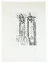 ?Portrait Laszlo mit Kopf zwischen den Knien?. Offsetdruck. (Lose als Beilage im Programmheft der Studiobühne an der Universität Hamburg zu ?Sechs Einakter? von Carl Laszlo). Hamburg, Studiobühne an der Universität Hamburg, (1960). Einseitig bedruckter Offsetdruck (20,1 x 14,5 cm). [Programmheft: Qu.-8°. 16 S., OKart., Klammerheftung]. Offsetdruck nach einer 1960 in Basel entstandenen Tuschezeichnung Hundertwassers. Laszlo und Hundertwasser standen in dieser Zeit in Kontakt, 1959 war in der von Carl Laszlo in Basel herausgegebenen Kunstzeitschrift ?Panderma? [Nr. 3] Hundertwassers großformatige Lithographie ?Die Flucht des Dalai Lama? erschienen. - Das Programmheft mit Beiträgen von Carl Laszlo, Bazon Brock (?Ein chinesischer Kaiser spielt Schach. Zu Carl Laszlos Bühnenstücken?; zusammen mit Brock hat Hundertwasser, der im Wintersemester 1959/60 als Gastdozent an der Hochschule für bildende Künste Hamburg tätig war, die Aktion ?Der Zug einer Linie? [auch als ?Die Linie von Hamburg? bzw. ?Große Hamburger Spirale? bezeichnet] initiiert) und Albert Schulze Vellinghausen (?Wer das Theater liebt, muss ihm Unruhe wünschen? u.a. - Beim Einakter ?Die Stunde der Balearen? spielte Claus Peymann einen der drei Balearen. - Ecken tlw. min. bestoßen. Die letzten Bll. seitlich m. winzigem Randeinriss. - Das Programmheft wohl nur in kleiner Auflage nach den Typoskripten hektographiert.