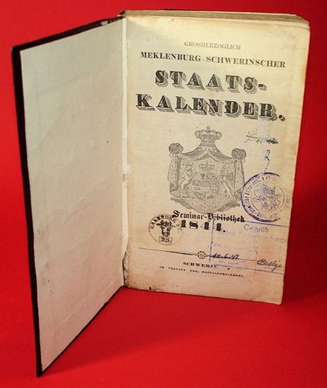 Großherzoglich Mecklenburg-Schwerinscher Staats-Kalender. 1844. Schwerin : Bärensprung, 1844. S. XXXII, 362, XXXVI, 247 8° , Pappeinband , Gutes Exemplar mit geringen Gebrauchsspuren, Eintragungen und Stempel auf Titel. Darin: Zeitkalender, Personal-Staat des Großherzogtums Mecklenburg-Schwerin, Statistisch-Topographisches Jahrbuch des Großherzogtums Mecklenburg-Schwerin (mit) Genealogisches Verzeichnis der jetzigen Europäischen Regenten, so wie derjenigen Europäischer Abkunft (und) Topographie des Großherzogtums Mecklenburg-Schwerin.