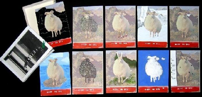 Schaap op het droge. Amsterdam, Boekie Woekie, 1987. 11x16 m. 10 übermalte Postkarten. In losen Blättern in Holzkistchen. Jede Postkarten mit einer wiederholten Schaf-Abbildung, jeweils mit Aquarellfarbe übermalt und handschriftlich monogrammiert. - Holzkistchen leicht beschädigt.