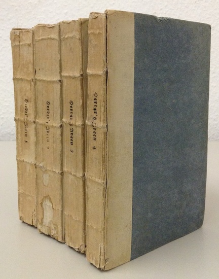 Ideen zur Philosophie der Geschichte der Menschheit. 4 Bände. Riga u. Leipzig, Hartknoch (Band 1-3) u. Karlsruhe, Schmieder (Band 4), 1785-92. Alte Interimspappbände (bestoßen, Rücken gebräunt u. fleckig, Gelenke teils angeplatzt). Band 4 mit Impressum Karlsruhe, Schmieder und "Riga, beim rechtmäßigen Verleger". "Herder sieht in der Geschichte eine Erziehung des Menschengeschlechtes, durchgeführt von einer höheren Macht. Er legt ... der Geschichte einen göttlichen Heilsplan zugrunde." Er wirkte damit auf "die geschichtsphilosophische Spekulation und die Geschichtsschreibung der Romantik" stark ein. - Goedeke IV/1, 730, 79; Fueter 407ff.; Borst 480. - Etwas gebräunt u. stockfleckig, Band 2 stärker u. teilw. feuchtigkeitsfleckig. Vorsätze mit altem Namenseintrag.