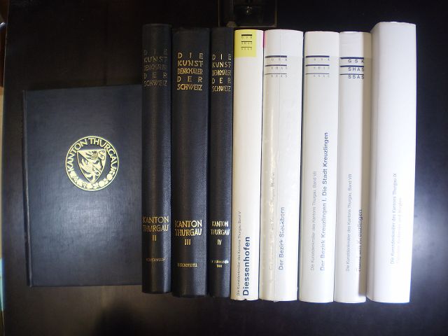 Die Kunstdenkmäler des Kantons Thurgau. Bände 1 bis 9 Basel / Bern, Birkhäuser Verlag / Wiese Verlag / Gesellschasft für Schweizerische Kunstgeschichte GSK, 1950-2018, Auflage: 1. Leinen, gebunden; schwarze, goldgeprägte Einbände, mit farbig illustrierten Schutzumschlägen (Bde. 5-9) / 9 Bände / Anz. Seiten: ca. 3500 / 20 x 26 cm / mit zahlreichen, teils farbigen Abbildungen / Zustand: sehr gut, geringe Gebrauchsspuren; Einbände teils etwas berieben (Bde. 1-5), neuwertiges, originalverschweisstes Exemplar (Bd. 6). = Die Kunstdenkmäler der Schweiz, 23., 34., 48., 83., 85., 98., 115., 125., 137. Band des Gesamtwerkes.