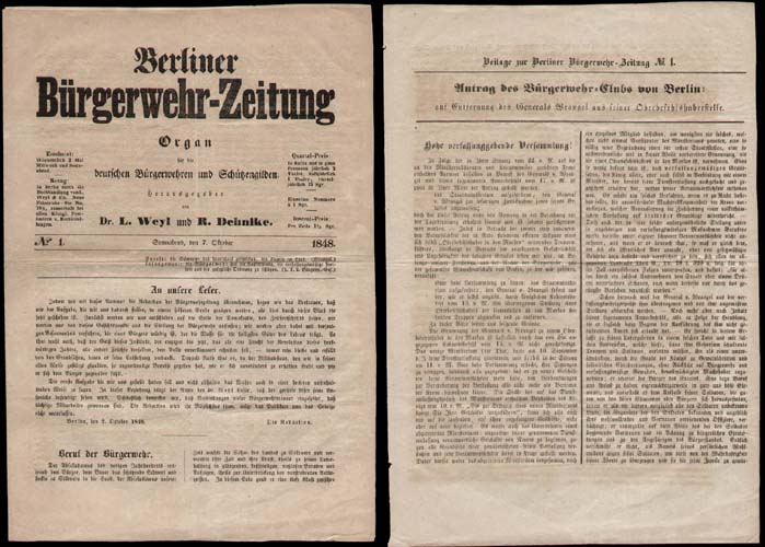 Berliner Bürgerwehr-Zeitung. Organ für die deutschen Bürgerwehren und Schützengilden. Nr. 1, Sonnabend, den 7. Oktober 1848. Berlin, Friedländer, 1848. 4 ungezählte Seiten und 2 Seiten "Beilage zur Berliner Bürgerwehr-Zeitung No. 1". 30 x 21 cm. Die erste Nummer der Bürgerwehrzeitung mit neuer Redaktion und dem Zusatz "Berliner". Seltenes Organ für die Bürgerwehren, die in der Märzrevolution 1848 eine entscheidende Rolle gespielt haben. Es stellt sich "entschieden auf die Seite der Demokratie" und kritisch dem alten Militärstaat gegenüber. Die vorliegende Nummer enthält Artikel über den Beruf der Bürgerwehr sowie Nachrichten "in einer heiteren unterhaltenden Weise". Die Beilage enthält den "Antrag des Bürgerwehr-Clubs von Berlin: auf Entfernung des Generals Wrangel aus seiner Oberbefehlshaberstelle." - Leicht gebräunt.