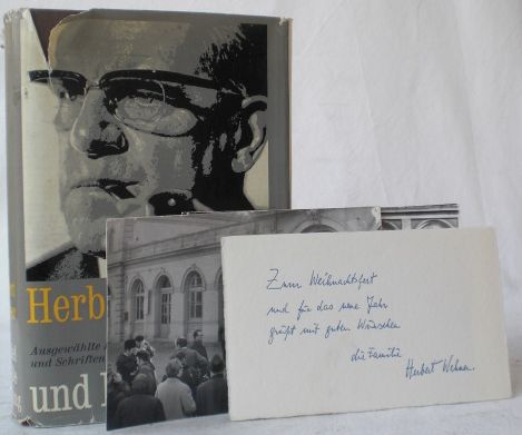 Wandel und Bewährung. Ausgewählte Reden und Schriften 1930-1967. Herausgegeben von Hans-Werner Graf Finckenstein und Gerhard Jahn. Mit einer Einleitung von Günter Gaus. Exemplar mit zahlreichen Beigaben, wie Autographen, Photographien etc.. Frankfurt und Berlin: Ullstein / Hannover, J. H. W. Dietz Nachf. 1968. XXIII, 398 S. 8°. Schutzumschlag lädiert (Randeinrisse und Randfehlstellen); Einband gering berieben und bestoßen. Exemplar aus dem Besitz des schwedischen Diplomaten Sven Backlund (1917-1997). Backlund, der politisch und privat mit Willy Brandt und Herbert Wehner befreundet war, wurde 1964 schwedischer Generalkonsul in West-Berlin, war dann eine Zeitlang Botschafter bei der EG in Brüssel und von 1972 bis 1983 schwedischer Botschafter in Bonn. Beiliegend zwei eigenhändige Postkarten von Herbert Wehner an Sven Backlund und eine eigenhändige Postkarte von Wehner an dessen Frau Kristina Backlund (die Postkarte an Kristina Backlund nur mit Herbert unterschrieben) - die Postkarten aus den Jahren 1969 und 1970 sind in schwedischer Sprache verfasst. Außerdem beiliegend 2 signierte Portraitpostkarten (Autogrammkarten) von Herbert Wehner, 2 Karten (faksimilierte Handschrift) mit Weihnachts- bzw. Neujahrswünschen der Familie Wehner "Zum Weihnachtsfest und für das neue Jahr grüßt mit guten Wünschen die Familie Herbert Wehner" bzw. "Ein Jahr des Friedens und der Freiheit von Furcht wünscht die Familie Herbert Wehner" (die 2. Karte im handschriftlich adressierten Kuvert an die Familie Sven Backlund in Brüssel - auf der Rückseite des Kuverts gedruckt "Herbert Wehner 532 Bad Godesberg"), eine handschriftliche Karte von Lotte (Charlotte) Wehner (in Schwedisch und Deutsch - nur mit "Lotte" unterschrieben), ein gedrucktes Dedikationskärtchen "Mit freundlichen Grüßen Herbert Wehner" mit handschriftlicher Adresse von Backlund und den Unterschriften "Lotte u. Greta" (= Lotte Wehner und ihre Tochter Greta Burmester, die damalige Stieftochter und spätere Ehefrau von Herbert Wehner), 4 kleine Urlaubsphotos (2 farbig, 2 schwarz-weiss) - wohl von einem gemeinsamen Aufenthalt von Wehner und Backlund in Wehners Ferienhaus auf Öland im Jahre 1970 (Wehner selber ist nur auf einem Photo zu erkennen - die Photos verso mit Bleistift bezeichnet "aug. 70 Wehner Öland"), 4 schwarz-weisse Photos des Besuches von Willy Brandt in Erfurt ("Erfurter Gipfeltreffen") am 19. März 1970 - es dürfte sich um zeitnahe Abzüge handeln (die Photos mit kleinen Schichtschäden an den Rändern) - eines der Photos verso mit dem Eintrag "David Binder (Erfurt, March 19. 1970)" und ein maschinenschriftlicher Brief des amerikanischen Diplomaten Robert Gerald Livingston an Sven Backlund, mit dem Briefkopf "Embassy of the United States of America", dat. "Bonn/Bad Godesberg Germany February 10, 1969" - der handschriftlich "Gerry" unterschriebene Brief zu einem Besuchervisum für die USA und zu einem Treffen von Backlund und Livingston 2 Wochenenden vorher (Brief mit Knickspuren).