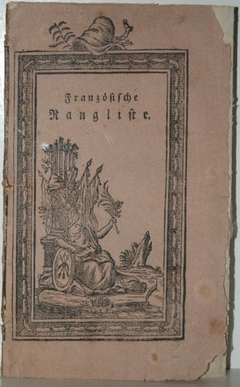 Vollständige Rangliste aller Generale und General-Adjutanten in den Armeen der französischen Republik. - Nebst einer umständlichen Anzeige ihres Standes vor der Revoluzion, der Zeit ihrer Kriegsdienste, ihres Avanzements, ihrer militärischen Talente und Eigenschaften, und der Armee, wo ein jeder steht, nebst einer Liste aller Generale die seit dem Anfang der Revoluzion ein Kommando geführt haben, vor dem Feinde geblieben, gestorben, hingerichtet oder ausgewandert sind. Aus dem Französischen. Ohne Ort und Verlag, 1796. 18 x 10,7 cm. 4 Blatt, 104 Seiten und eine gefaltete "Vergleichungs-Tabelle". Orig.-Broschur (Broschur mit geringfügigen Randläsuren). *Die erste Rangliste in deutscher Sprache für die junge französische Armee der Nationalversammlung. - Nach dem Sieg der französischen Revolution wurden neue Generäle, Offiziere und Befahlshaber aus den Reihen des Bürgertums eingesetzt und die alten königstreuen Generäle entlassen. Die neuen, in Europa bisher kaum bekannten Generäle und Befehlshaber wurden mit dieser Rangliste erstmals im deutschsprachigen Raum bekanntgemacht. - Etwas gebräunt, insgesamt ordentlich erhalten.