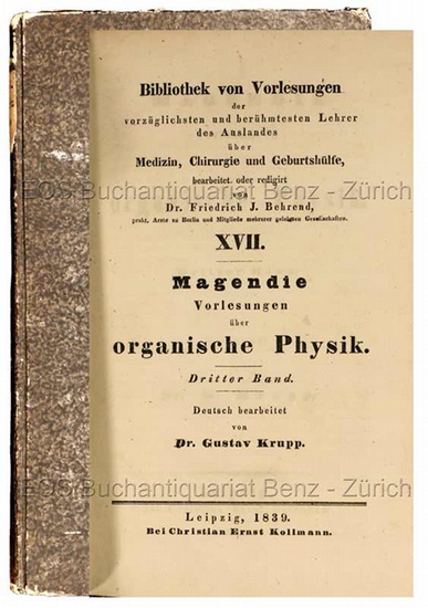 Vorlesungen über organische Physik. Dritter Band. Deutsch bearbeitet von Gustav Krupp. Leipzig, Christian Ernst Kollmann, 1839. 8°. (4), 284 S. Pappband der Zeit mit Kleisterpapierbezug. + Wichtig: Für unsere Kunden in der EU erfolgt der Versand alle 14 Tage verzollt ab Deutschland / Postbank-Konto in Deutschland vorhanden +, Einband u. Titelblatt. Aus der Reihe: "Bibliothek von Vorlesungen der vorzüglichsten und berühmtesten Lehrer des Auslandes über Medizin, Chirurgie und Geburtshülfe", Band 17. - Mit 24 Vorlesungen des französischen "ruhmreichsten französischen Experimental-Physiologen der Neuzeit" (Hirsch), François Magendie (1783-1855). - Einband berieben und bestossen.
