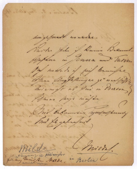 Eigenh. Brief mit U. ("Milde"). Berlin, 8. IX. 1849. 2 SS. Gr.-4to. Möglicherweise an den Schriftsteller Karl von Holtei (1798-1880): "Der mir geneigtest eingesandte Artikel ist in der schlesischen Zeitung [...] abgedruckt und in französischer Uebersetzung an die Indépendance eingesandt worden [...]". - Stark gebräunt und mit kleinen Randläsuren; aus der Sammlung des Schriftstellers Karl von Holtei und mit kleinen Anmerkungen aus dessen Hand.