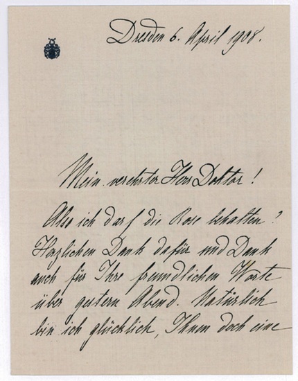 Eigenh. Brief mit U. Dresden, 6. IV. 1908. 3 SS. auf Doppelblatt. 8vo. An den namentlich nicht genannten Komponisten und Musikkritiker Ludwig Hartmann (1836-1910): "Also ich darf die Rose behalten? Herzlichen Dank dafür und Dank auch für Ihre freundlichen Worte über gestern Abend. Natürlich bin ich glücklich, Ihnen doch eine kleine Freude bereiten zu dürfen, indem ich Ihnen ein Lied vorsinge. Bitte sagen Sie mir nur den Titel, damit ich es mir vor meiner Abreise noch schnell besorgen kann. Der Doktor schickt mich nämlich nächsten Donnerstag auf 14 Tage fort. Ich habe leider mein ganzes Leben hindurch mit Blutarmut zu thun, die stets im Frühjahr und wenn meine Seele beschwert ist, mich arg mitnimmt [...]". - Die Schwester von Frank und Donald Wedekind hatte bei Aglaja Orgéni in Dresden studiert, wo sie 1894 in der Partie der Frau Fluth in den "Lustigen Weibern von Windsor" debütierte. "Wedekind war bis 1909 erste Koloratrice an der Hofoper in Dresden; ihre Glanzrolle war die Titelheldin in 'Mignon'. 1907 sang sie in der Uraufführung der Oper 'Die Schönen von Fogaras' von Alfred Grünfeld die Partie der Verona" (DBE). Zudem gastierte sie u. a. in Berlin, Hamburg, Wiesbaden und München, an der Hofoper in Wien, am Stadttheater in Zürich und an der Covent Garden Opera in London. Bis 1926 war sie auch als Konzertsängerin erfolgreich. - Auf Briefpapier mit gepr. Vignette.