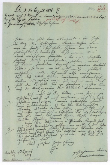 Eigenh. Brief mit U. ("Windischmann"). Aschaffenburg, 7. IV. 1811. 1 S. 4to. An den namentlich nicht genannten Altphilologen und Redakteur der "Jenaischen allgemeinen Literaturzeitung" Heinrich Karl Abraham Eichstädt (1771-1848) betr. seiner Rezension von Goethes "Farbenlehre": "Euer Wohlgeboren haben nun seit dem November vor[igen] Jahr[es] die Rez[ension] der Göthischen Farbenlehre von mir in Handen. Ich hatte Ihnen im Übersendungsbriefe bemerkt, daß, wenn Sie etwas auszusetzen fänden, Sie mir dieselbe sogleich wieder zurücksenden sollten, weil ich keinen fremden Eingrif[f] in meine Arbeit dulden, sondern wo es nothwendig, selbst nachhelfen will. Ich muß also annehmen, daß diese Arbeit keinen weiteren Bedenklichkeiten ausgesetzt war und nehme mir deshalb die Freiheit Sie zu fragen, woher nun noch die Verzögerung des Abdrucks komme [...]". - Windischmanns ausgesprochen positive Rezension sollte mit gehöriger Verzögerung erst im Januar 1813 erscheinen. - C. J. H. Windischmann wirkte seit 1818 als Professor der Philosophie an der damals neugegründeten Universität Bonn und lehrte auch Enzyklopädie und Geschichte der Medizin an der Medizinischen Fakultät. "In seinen Publikationen behandelte er medizinische, naturphilosophische und philosophische Themen; 1804 erschien von ihm eine Übersetzung des 'Timaios' von Platon. Im romantischen Geist der Zeit verstand Windischmann die historische Betrachtung zugleich als Gegenwartsanalyse und Zukunftsprognose [...] und setzte sich für eine Verbindung der Medizin mit der Philosophie und Theologie ein" (DBE). - Mit einigen zeitgenöss. Bemerkungen und Notizen von anderen Händen.
