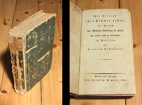 Wie Gertrud ihre Kinder lehrt, ein Versuch den Müttern Anleitung zu geben, ihre Kinder selbst zu unterrichten, in Briefen. Bern und Zürich, Heinrich Gessner, 1801. Pappband der Zeit mit handschriftlichem Rückenschildchen, 390 Seiten, 8°. Seltene erste Ausgabe dieses wichtigen pädagogischen Grundwerks. Ohne das nur ganz wenigen Exemplaren beigefügte Portrait. Der Einband ist berieben, bestossen und am Rücken eingerissen. Das Vorsatzblatt wurde mit einem handschriftlichen Inhaltsverzeichnis und auf der Rückseite mit einem Datum (1802) versehen. Auch auf dem hinteren Vorsatz findet sich ein kleiner handschriftlicher Eintrag aus dieser Zeit. Der Buchblock ist etwas schiefgelesen, aber nur wenig fleckig / gebräunt und insgesamt gut erhalten. Sehr vereinzelte Passagen wurden (in der Zeit) mit kleinen Anstreichungen (tlw. Anmerkungen) versehen. Alle Mängel wurden bei der Preisfindung berücksichtigt. Weitere Bilder des Titels können gerne per Mail angefordert werden. Pestalozzi beschreibt in den Briefen an seinen Verleger Heinrich Gessner die grundlegenden pädagogischen Erfahrungen, welche er an seinem berühmten Erziehungsinstitut im Schloss Burgdorf sammelte und theoretisch begründete.