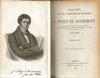 Biographie Travaux et Correspondance Diplomatique de C. Pictet de Rochemont, (Depute de Geneve Aupres, du Congres de Vienne, 1814, envoye extraordinaire et ministre plenipotentiaire de la Suisse a Paris et a Turin, 1815 et 1816) 1755-1824, Geneve: H. Georg Libraire-Editeur. 1892. 1. Ausgabe, 444 S. avec un portrait et une carte, selten, Halbleinen, a.d. Rändern berieben, Kanten etw. bestoßen, Rücken goldgeprägt, oben und unten gering fransig, Stempel auf Innendeckel u. Vorsatzblatt, vom Buchblock gelöst (einfache Restaurierung nötig) (Pictet de Rochemont zählt zu den überragenden Figuren des Genfer politischen u. landwirtschaftlichen Lebens. Seine Bedeutung als Züchter u. Betreiber eines Mustergutes stehen seinen politischen Leistungen als Vertreter der Schweiz nicht nach),.