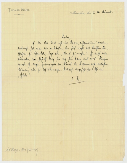Eigenh. Brief mit U. (Initialen). München, 3. XII. [1900] abends. ? S. Gr.-4to. Auf Briefpapier mit Briefkopf "Thomas Mann". An seinen Jugendfreund, den späteren Kunsthistoriker und Romanisten Otto Grautoff (1876-1937): "Lieber, ich bin dies Mal nicht ins Revier 'aufgenommen' worden, vielmehr hat man mir anbefohlen, den Fuß nachts mit feuchten Umschlägen zu behandeln, tags aber 'Dienst zu machen'. Ich muß nur abwarten, was Hofrath May für mich thun kann und wird. Morgen werde ich wegen Zeitmangels vor Abend die Kaserne nicht verlassen können; aber sei doch übermorgen, ungefähr 3/4 1 Uhr im 'Gisela' [...]". Kl. Randeinrisse und -ausbrüche (keine Textberührung). - Nach Grautoffs Tod im Pariser Exil erwarb der Verleger Kurt Leo Maschler (1898-1986) die Korrespondenzsammlung von dessen Witwe Erna Grautoff. Nach Maschlers Flucht aus Österreich 1938 wurde der zurückgelassene Bestand von der Gestapo der ÖNB überstellt und von dieser in deren Autographensammlung einsigniert (am unteren Rand die ÖNB-Signatur von 1939: Autogr. 141/58-59). 1949 wurde die Sammlung an Maschler rückgestellt (vgl. ÖNB, Allg. Verwaltungs- u. Korrespondenzakten 00/1949 A); erworben aus dem Nachlaß Maschler. - T. Mann, Briefe an Otto Grautoff 1894-1901 und Ida Boy-Ed 1903-1928, hg. von Peter de Mendelssohn (Frankfurt a. M. 1975), S. 127. Die Briefe Thomas Manns. Regesten und Register. Bd. I. Briefe 1889-1933, bearb. und hg. von Hans Bürgin u. a. (Frankfurt a. M. 1976) 00/31. Nicht bei T. Mann, Große Frankfurter Ausgabe, Briefe I (1889-1913) (Frankfurt a. M. 2002).
