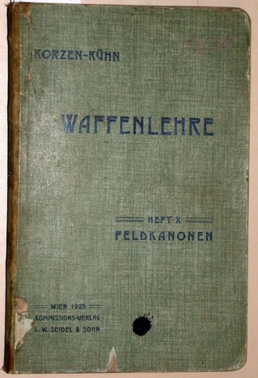 Waffenlehre. Herausgegeben von Anton Korzen und Rudolf Kühn. Heft X. Feldkanonen. Mit 14 Figurentafeln. Wien: Im Kommissionsverlage bei L. W. Seidel & Sohn. 1905. 5 Bll., 243 S., 2 Bll. Tabellen; 14 gefaltete Tafeln,. Einband berieben und bestoßen, teils sichtbare Rückstände einer Bibliotheks-Signatur und etwas fleckig; Bibliotheksstempel auf dem Titelblatt; ansonsten innen nur schwache Gebrauchsspuren; insgesamt noch sauber - ein noch befriedigend erhaltenes Lese-/Beleg-Exemplar aus dieser sehr seltenen Waffenlehre . Textlich und mit allen Tafeln vollständig.
