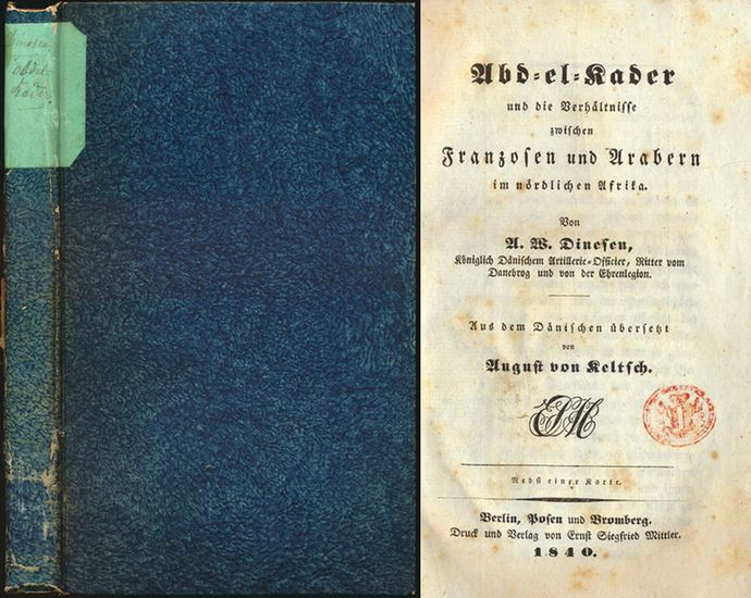 Abd-el-Kader und die Verhältnisse zwischen Franzosen und Arabern im nördlichen Afrika. Aus dem Dänischen übersetzt von August von Keltsch. Berlin, Posen und Bromberg, Druck und Verlag von Ernst Siegfried Mittler, 1840. Klein-8°. 18 cm. 216 Seiten. Pappband der Zeit mit einfachem handbeschriftetem Rückenschildchen. Erste Ausgabe. Kainbacher, S. 102. Mit der mehrfach gefalteten Karte "Karte von einem Theil der Regentschaft Algier". Kleiner Stempel auf Titel. Gutes, innen gutes bis sehr gutes Exemplar.