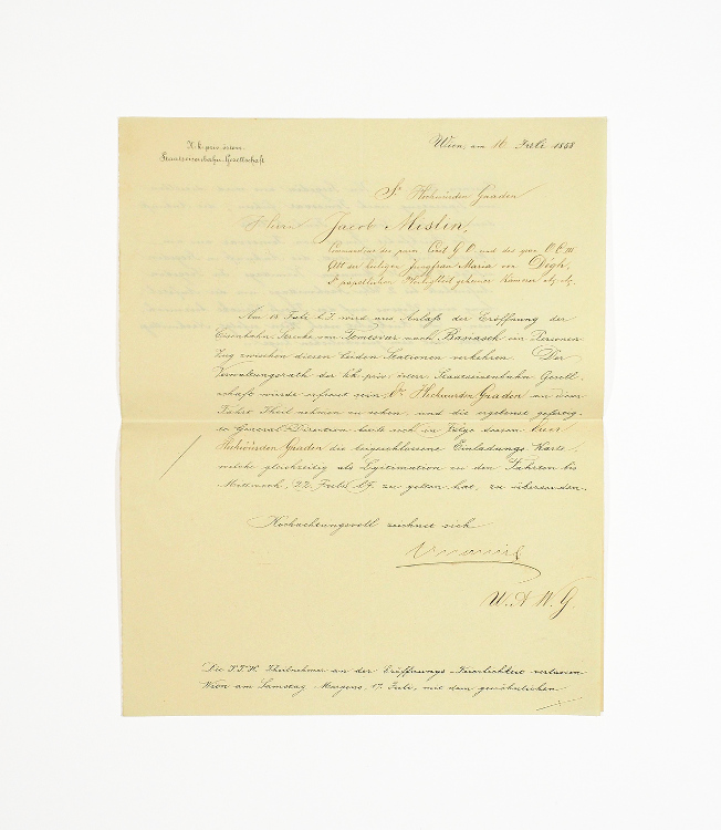 Gedruckte, handschriftl. ausgefüllte Einladung m. eigenh. Unterschrift. Wien, 16. VII. 1858. 2 S. auf Doppelblatt, 4°. ?Am 18. Juli l. J. wird aus Anlaß der Eröffnung der Eisenbahn-Strecke von Temesvar nach Basiasch [Bazias] ein Personen-Zug zwischen diesen beiden Stationen verkehren [...]. Es folgt eine kurze Erläuterung zum Ablauf der Feierlichkeiten. - Der Empfänger der Einladung ist Jacques (Jacob) Mislin (1807-1878). Der aus ärmlichen Verhältnissen stammende Mislin konnte dank seines Onkels an der berühmten Lehranstalt von Porrentruy im Schweizer Kanton Bern studieren, wo er nicht viel später auch selbst unterrichten sollte. Der 1830 zum Priester geweihte kath. Theologe wurde 1836 auf Vermittlung des Grafen von Bombelle an den Wiener Hof berufen, wo er einer der Lehrer der Söhne von Erzherzog Franz Karl und Erzherzogin Sophie wurde und damit sowohl den zukünftigen Kaiser Franz Joseph wie auch Erzherzog Ferdinand Maximilian (später Kaiser Max von Mexiko) unterrichtete (u.a. auch in Erdkunde). Vor der Revolution von 1848 unternahm Mislin eine Pilgerreise von Wien über Budapest und Konstantinopel nach Jersusalem. Der danach erschienene Reisebericht wurde in mehrere Sprachen übersetzt und mehrfach nachgedruckt. In den folgenden Jahren leitete er die Bibliothek am Hof der Herzogin von Parma, Erzherzogin Marie Louise, wurde zum Abt von St. Maria von Deg (Ungarn), geheimer Kämmerer u. Hausprälat Papst Pius' XI., Apostolischer Pronotar, Kanoniker der Kathedrale von Großwardein, Träger zahlr. Orden (u.a. von Spanien, Parma u. des Ritterordens vom Heiligen Grab zu Jerusalem) sowie Mitglied zahlr. Akademien. Der Verfasser zahlr. Publikationen und Vertraute des belgischen Königs und des Grafen von Chambord blieb nach der Rückkehr von seiner Pilgerreise in Wien, wo er weiterhin in persönlichem Kontakt mit dem Kaiserhaus stand.